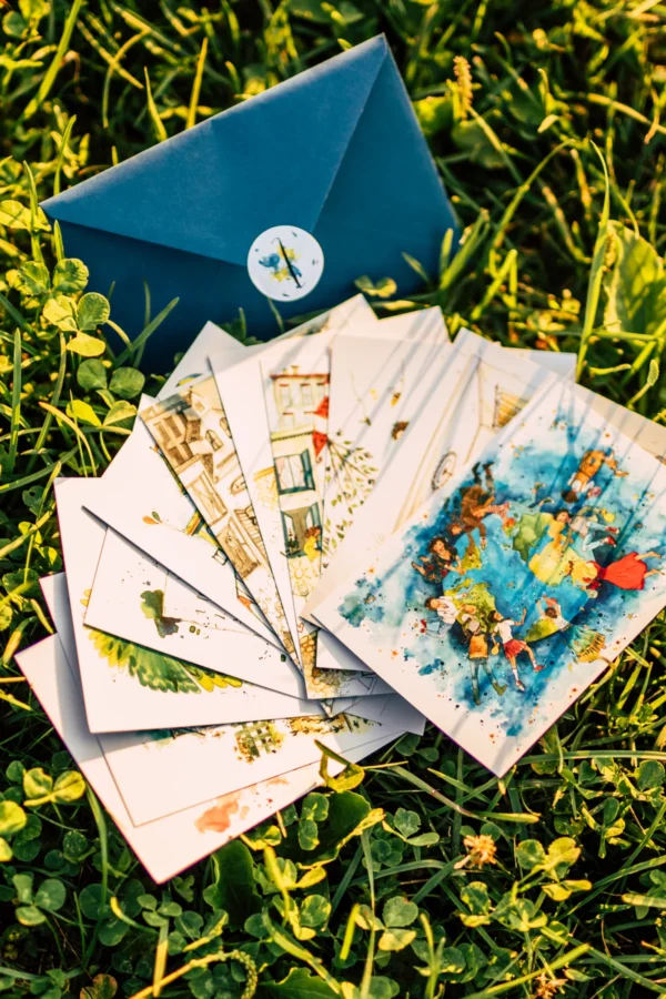 Komplet 12 kart z ilustracjami z książki. Każda opatrzona jest przesłaniem słownym. W zestawie jest 12 kopert w ciemnoniebieskim kolorze i 12 naklejek. W zależności od sytuacji możesz wysłać lub podarować bliskiej osobie wyraz swoich myśli i uczuć.